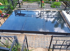 Укрываем внутреннюю зону участка геотекстилем и приносим три массивные прямоугольные плиты, которые в дальнейшем послужат наземным покрытием могилы.