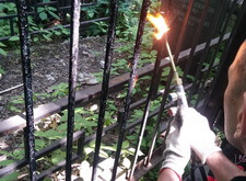 Мы заварили прутья, укрепили заднюю часть ограды и приступили к покраске. Начали процесс с зачистки ограды, а если быть точнее то с обжига старой краски. На некоторых фотографиях вы можете видеть как мы это делаем.